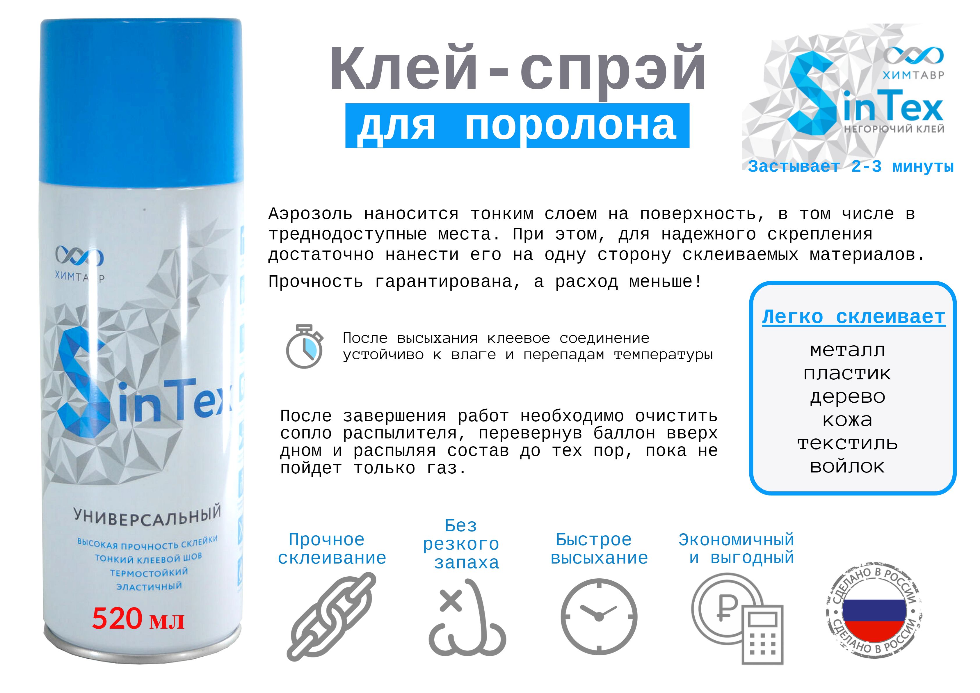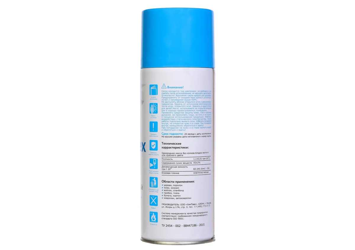 Описание Быстро и прочно клеит ― дерево, шпон, фанеру, бетон, камень, плитку, резину, металл, фольгу, пластики, поролон, картон, ткани, войлок, бумагу, пробку. Удобен в применении, конструкция распылителя позволяет изменять ширину распыления, что дает возможность экономично наносить клей на поверхность. Обладает высокой теплостойкостью. Не засыхает при хранении. Область применения : Производство мебели, одежды, обуви, упаковки, рекламы. Авиастроение, судостроение, автомобилестроение (тюнинг автомобильных салонов, решение проблем шумоизоляции и акустики ). Используется для фиксации пластиковых листов к цементным и асбестовым поверхностям при ремонте и изготовлении изоляционных материалов из полиуретана, искусственных волокон, пробки и т. д. При проведении строительных отделочных работ клей используется для приклеивания гибких материалов (ковровых покрытий, линолеума, поролона, мин. ваты, обивочных тканей, пробки, войлока, кожи и др.) на любое твердое основание (дерево, фанеру, ДСП, ДВП, кирпич, бетон, пластик). Эффективно заменяет двухсторонний скотч(1 баллон – на 50 м клеевого слоя шириной 5см) Позволяет приклеивать материалы непосредственно на бетонную стяжку (не боится пыльной поверхности) Допускается в течение 2-3мин. сдвиг покрытия (облегчает стыковку покрытия) При приклеивании материала на стену не требует длительного прижимания Позволяет приклеивать различные предметы к стеклу, находящемуся под воздействием солнечных лучей (например витрины магазинов).